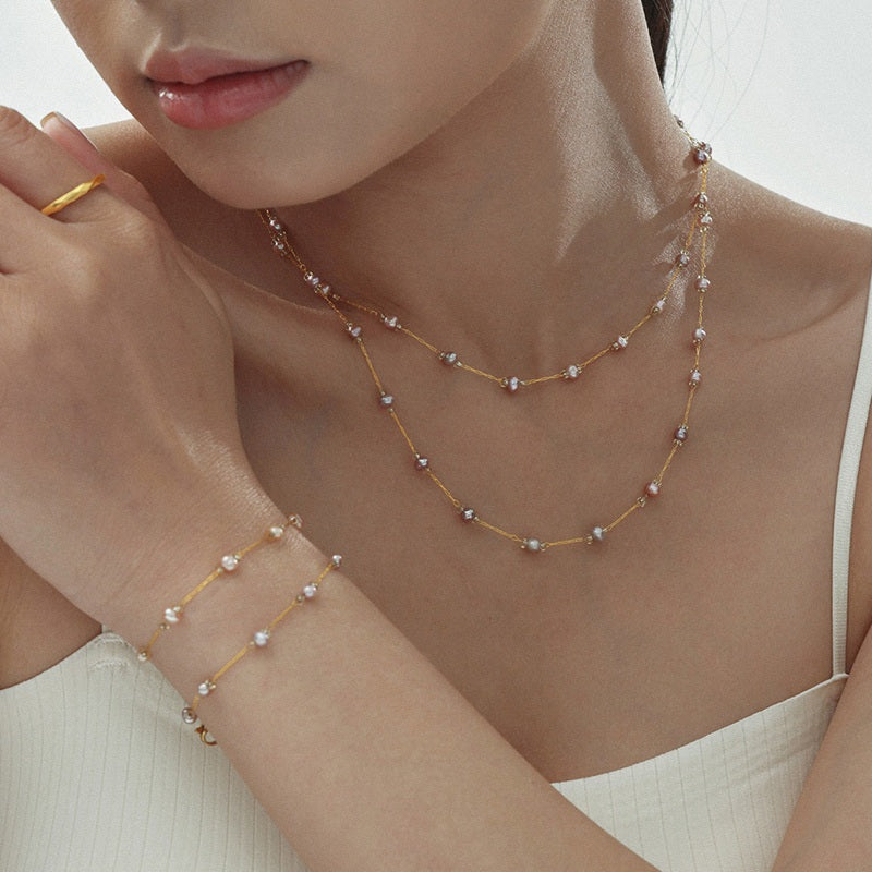 The Orchid Pearl necklace showcases soft light purple pearls elegantly spaced along a gold-plated station chain. Its delicate design adds a refined charm that complements any style effortlessly. Perfect for adding a touch of luxury to your everyday look.